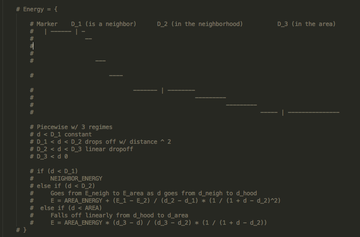 We will use a model inspired by atomistics that considers distance in 3 regimes: neighbors, neighborhoods, and areas. We parametrize the neighbor radius, neighborhood radius, and area radius to fit a variety of local densities. We also parameterize the neighbor energy, neighborhood energy, and area energy, to capture nonlinearities between the relative effects of a nearby Place as a neighbor or from way across town. Olive Gardens and prisons may behave differently in this sense.