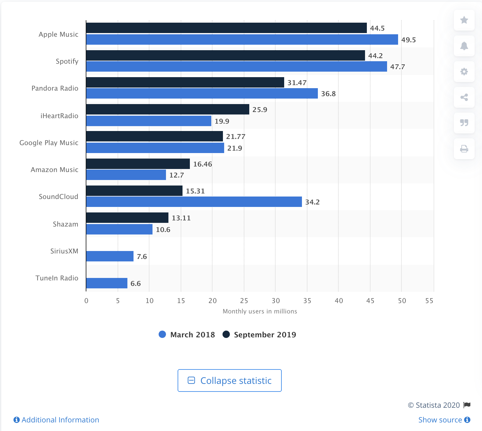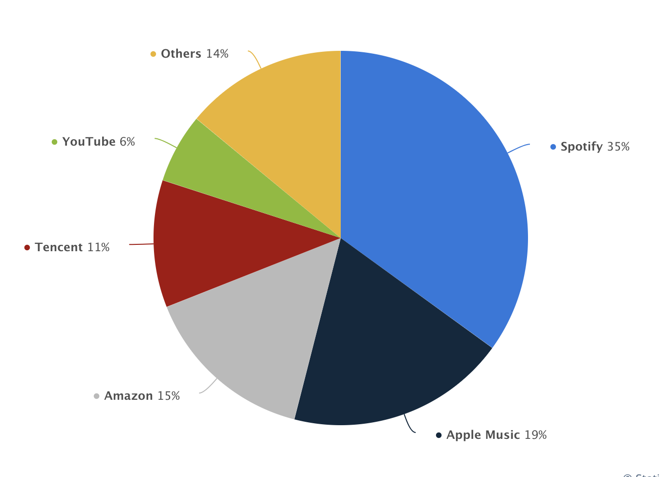 Approximate breakdown USA <img width="787" alt="Screen Shot 2020-06-13 at 9 01 06 PM" src="https://user-images.githubusercontent.com/6210452/84582401-8929e280-adb9-11ea-89f8-3521fb59baba.png"> Worldwide <img width="675" alt="Screen Shot 2020-06-13 at 8 59 28 PM" src="https://user-images.githubusercontent.com/6210452/84582413-a068d000-adb9-11ea-9de1-5bd466dc8dc4.png"> -- We'd likely aim for USA market, it might make the most sense to support apple music next.