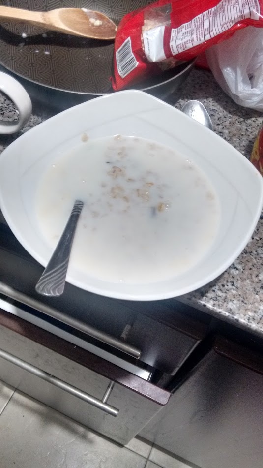 - Instructions 9. Pour 1/2 vase of water and 1/2 vase milk into the pan. 10. Boil it while adding the following ingredients. 1. Add a little salt. 2. Add a little sugar 3. Add cinnamon to taste. 11. Finally add the Oatmeal. 12. Let it boil until it dries a bit.