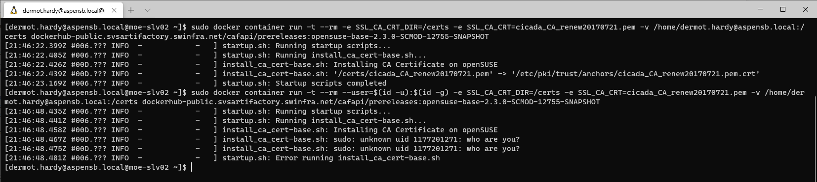 @dermot-hardy sudo will always use your real UID for permissions checks so it must map to a user who exists on the container. Setting the SetUID flag only works on binaries but some of the setup steps we need root permissions for are scripts (e.g. update-ca-certificates) We could add our own binary to execute arbitrary files similar to sudo but that seems like a big can of worms.