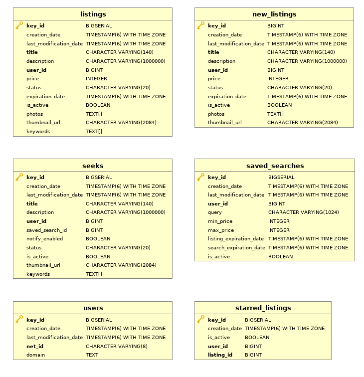 - listings: Includes all the items listed to be sold. When items expire or are marked as sold, their status is changed to "inactive", but they are not removed from the database.