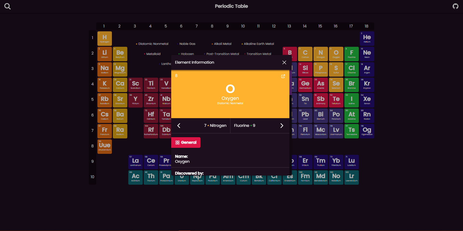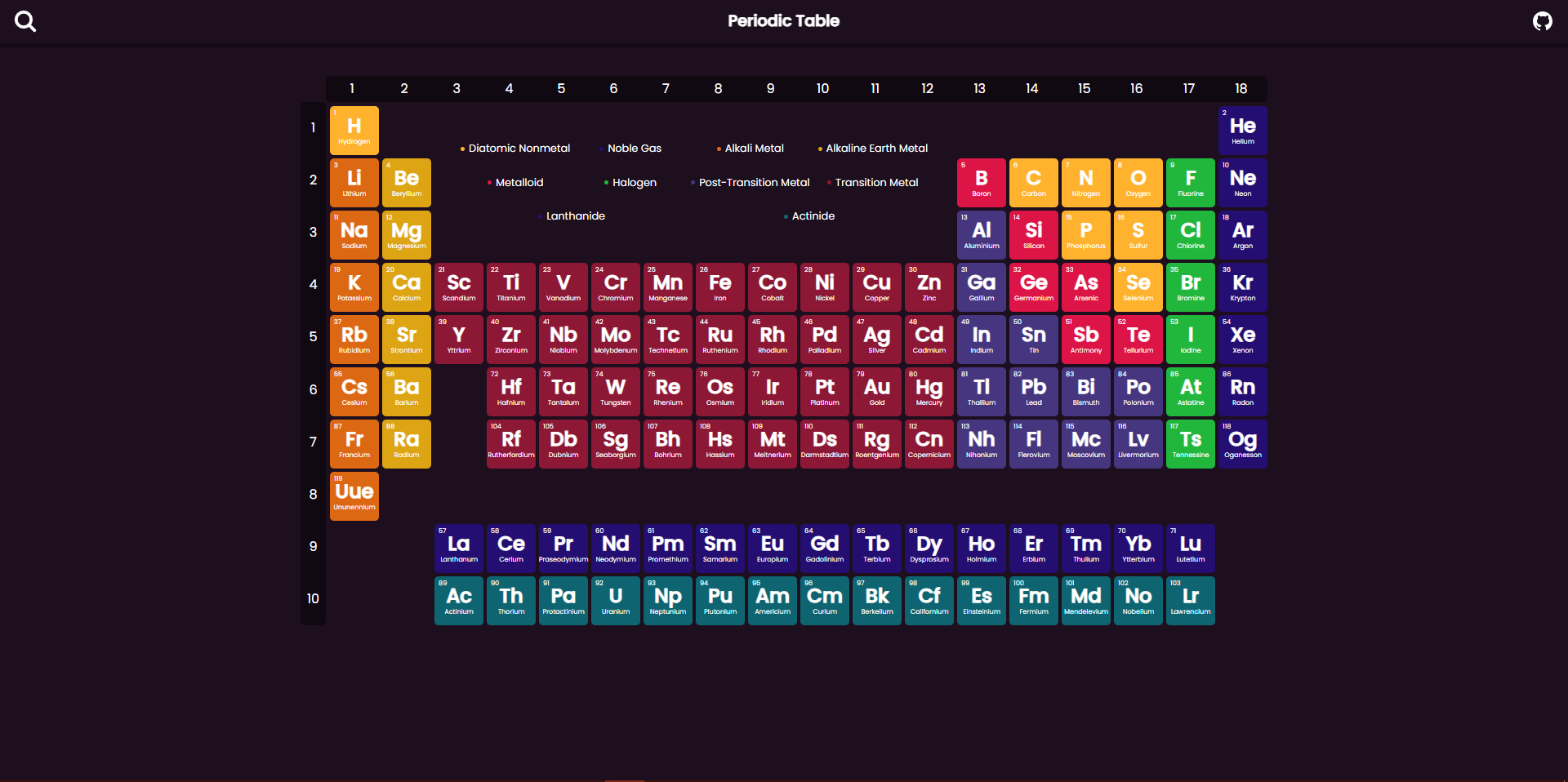 Busca e exploração de elementos químicos com interface interativa, modais de detalhes e visualização de camadas eletrônicas. Projeto feito em React e publicado no GitHub Pages.