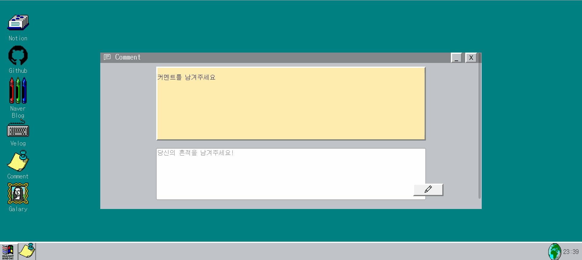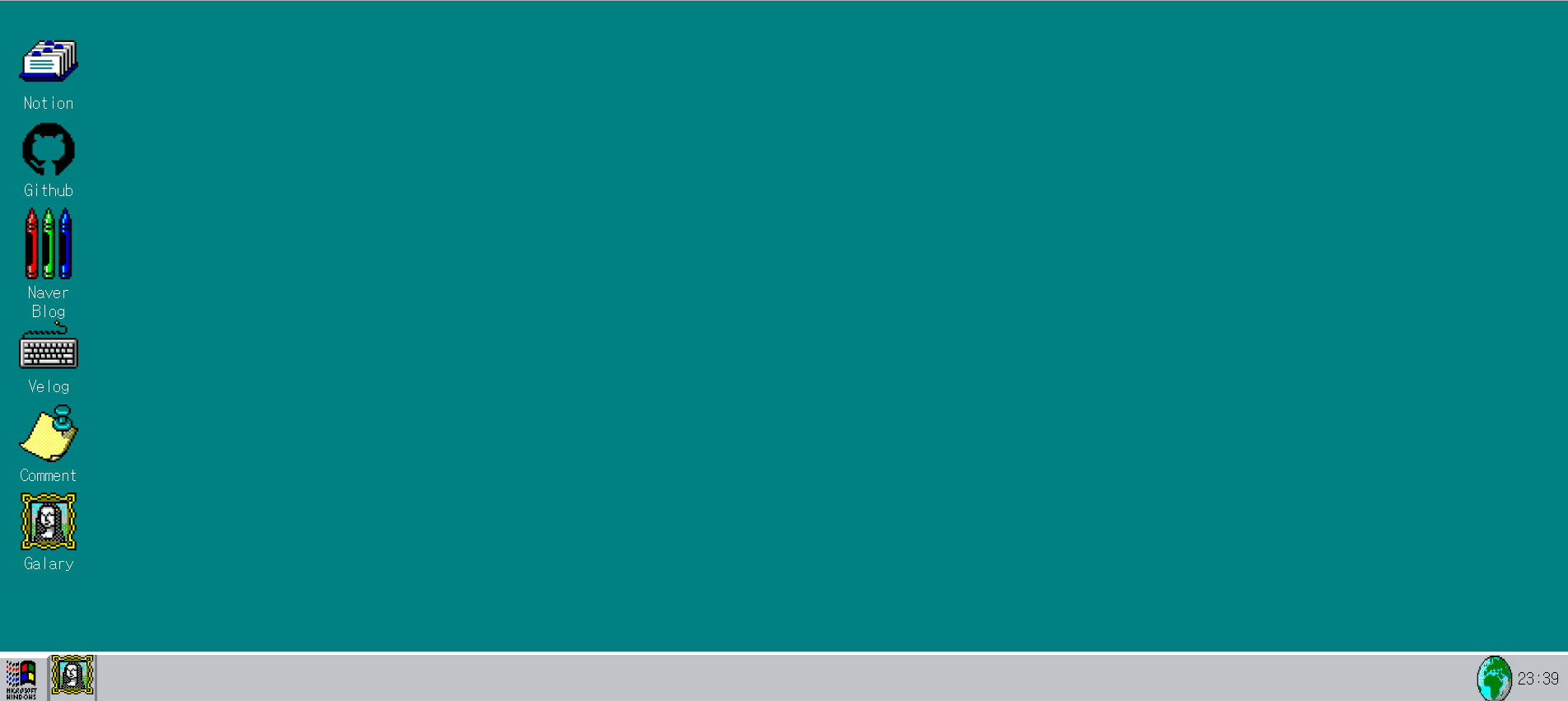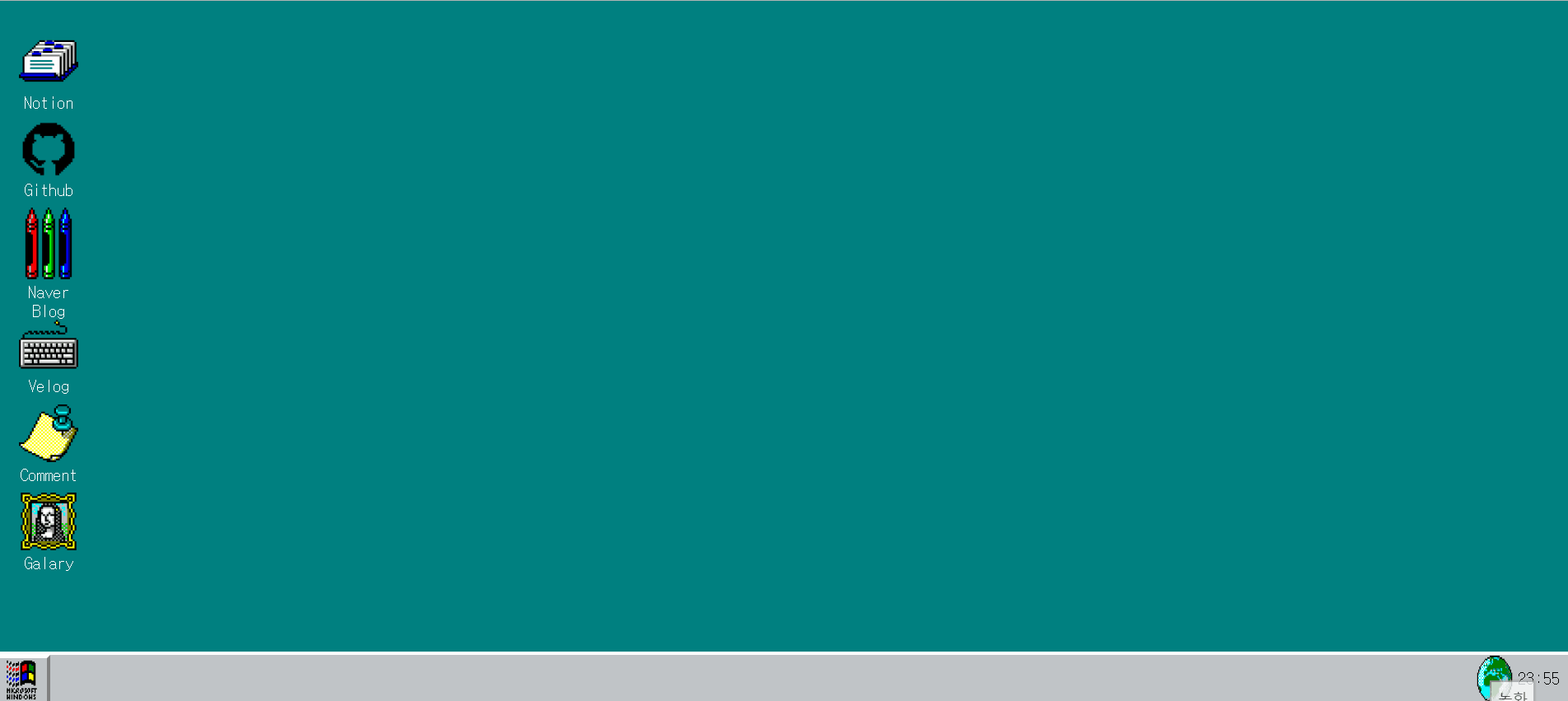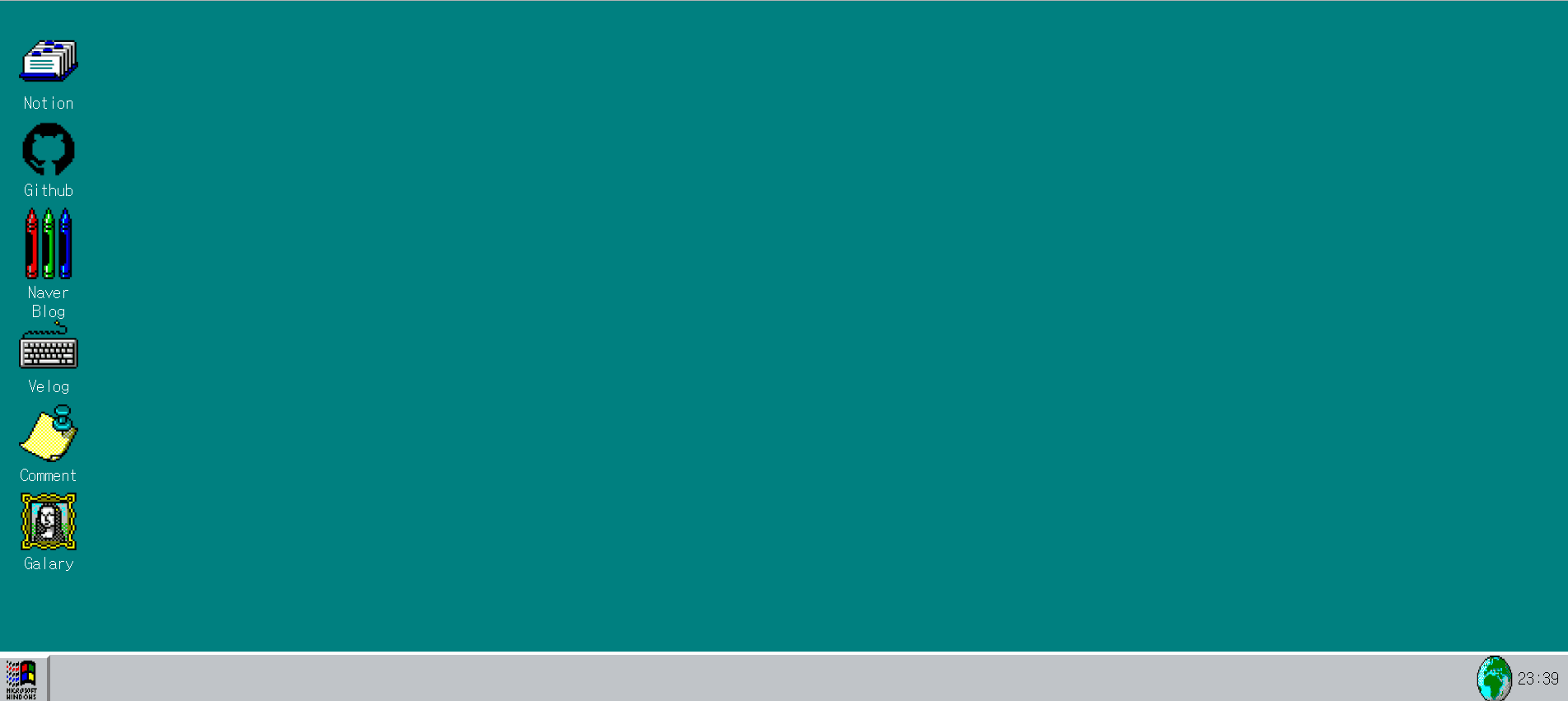 컨셉: window 3.1 목적: 자기소개 포트폴리오 웹사이트 사용 기술 스택: html, css, vanilla javacript 기간: 2023.8.4 ~ 2023.8.8 기능: