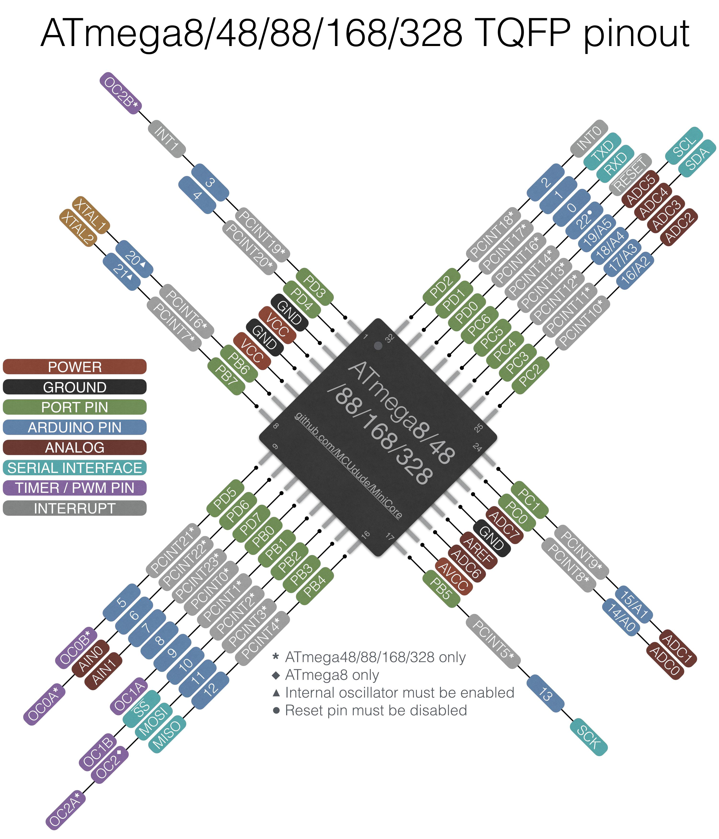 This core uses the standard Arduino UNO pinout and will not break compatibility of any existing code or libraries. What's different about this pinout compared to the original one is that this got three aditinal IO pins available. You can use digital pin 20 and 21 (PB6 and PB7) as regular IO pins if you're ussing the internal oscillator instead of an external crystal. If you're willing to disable the reset pin (can be enabled using high voltage parallel programming) it can be used as a regular IO pin, and is assigned to digital pin 22 (PC6). Click to enlarge: