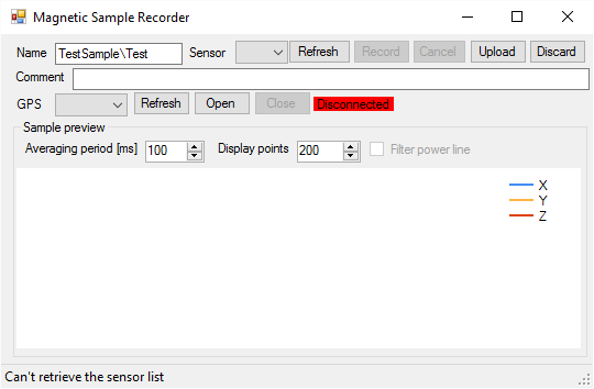 Set the sample name and comment of how you want it to appear Google Drive uploads. If the sample name contains \, it will create nested folders and the text after the last \ becomes the file name. You can set the name and commentary before or after the recording is done. The display and low-pass filter parameters in the Sample Preview box only affect the preview, the magnetic data is written at full rate with no filtering. Click "Record" to start recording, and "Cancel" to stop. The data will append to the magnetic data buffer. Click "Discard" to clear the buffer, or "Upload" to upload the data and clear the buffer. Clicking "Record" again without uploading or discarding the data will append the data to the current buffer contents.