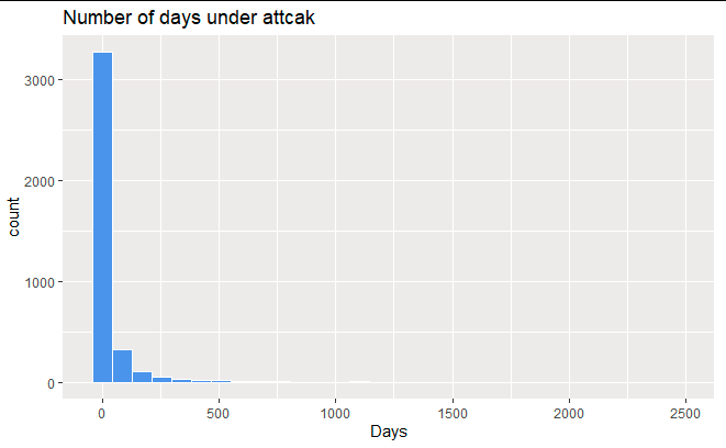 #and number of hours the attack occurred. The relationship is describe a weak negative, see cor.estimate(r) thus the p-value is high. We keep the null hypothesis. There is no relationship.