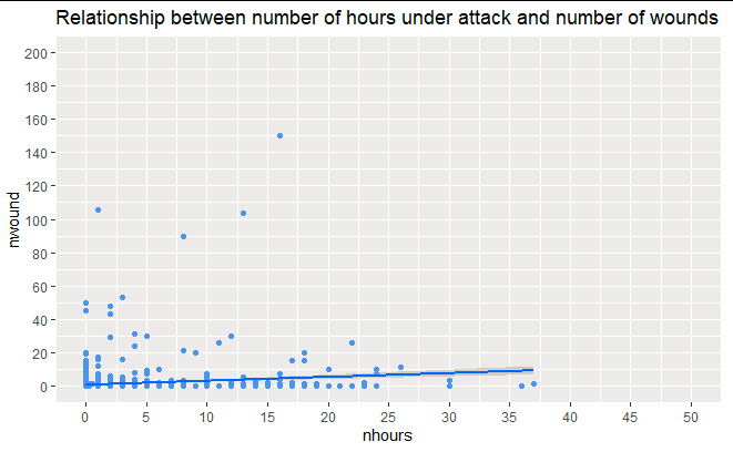 labs(title = "Relationship between number of hours under attack and number of wounds")
