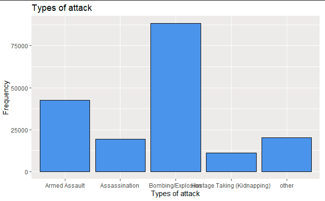 # To make the data easier to work with, we create a new data frame called Form_attack where the top 4 forms of of attack from attacktype1_txt in mydata are selected and the remainders are rolled into 'other'.