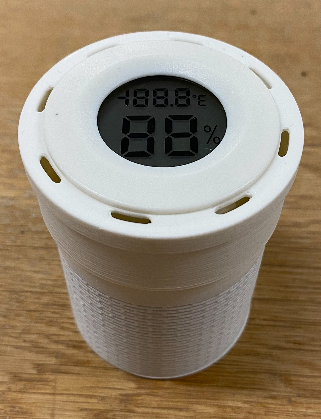 It has a temperature and humidity sensor in the top. The top is the lid for the silica gel container and is designed to draw air from the top to read correct values as the sensor has no direct holes to the silica gel container.