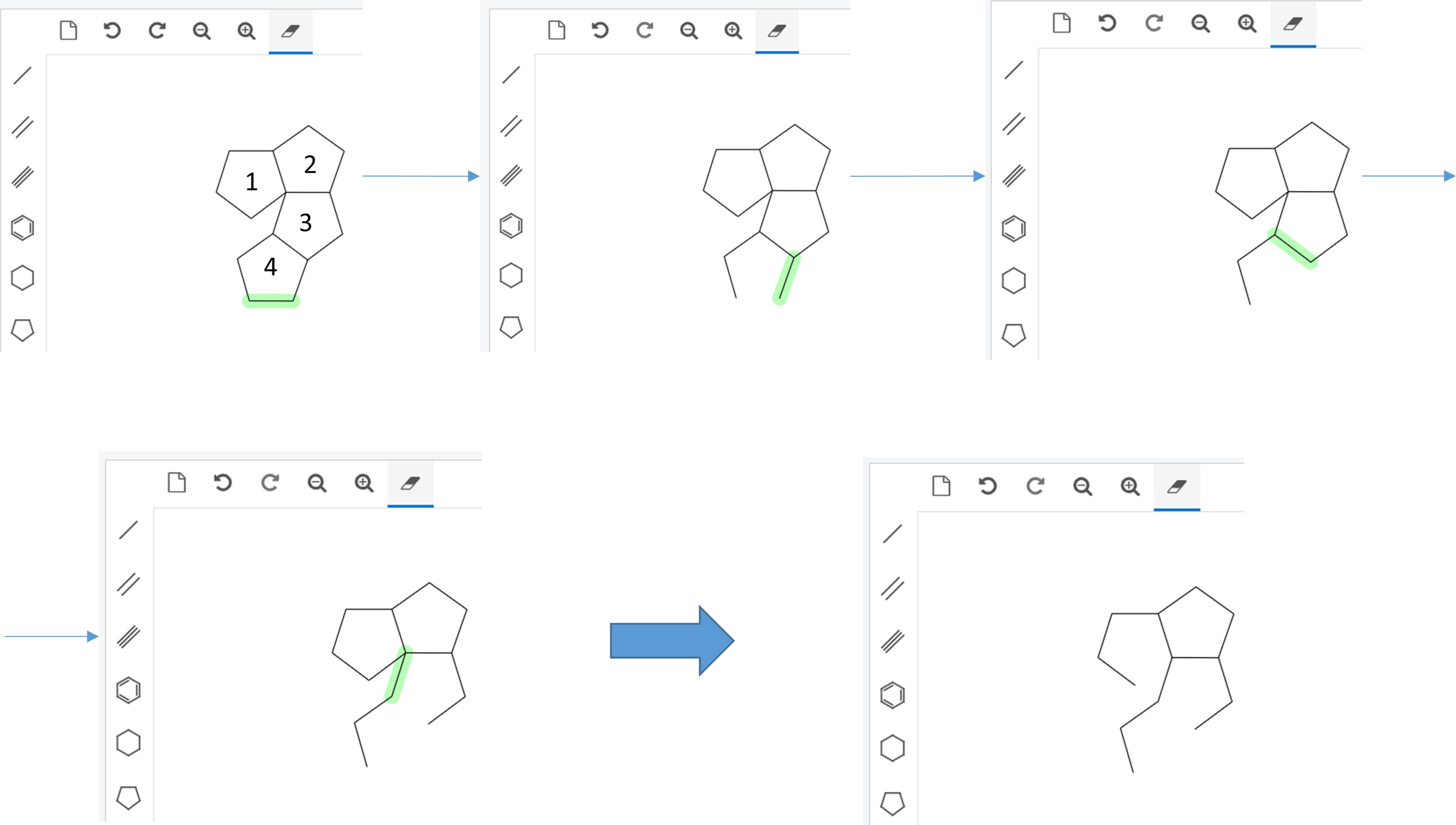 The attempt to delete a bond by the eraser tool yields at times the erasing of the neighbor bond. The issue is relatively rare but becomes evident after some time. While the problem could occur in a very simple situation, its reliable reproduction is non trivial. A sequence of steps leading to a reproducible issue is shown in the attached figure (the numbers in the cycles in the first image represent the sequence of drawing the cycles by the cyclopentane-tool via bond sharing; if the bonds are drawn differently, the issue might not reproduce). The issue might be connected by a bug in a stack-like storage of some connectivity information; interestingly the issue is not reproducible if the deletion sequence of the four bonds is interrupted by exiting to another browser tab, for example.