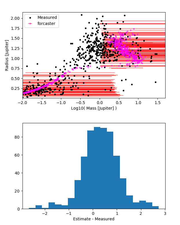 I am trying to compare a MR relationship to existing kepler data however the forecast function jumps drastically and I was wondering if I am using forecast properly?