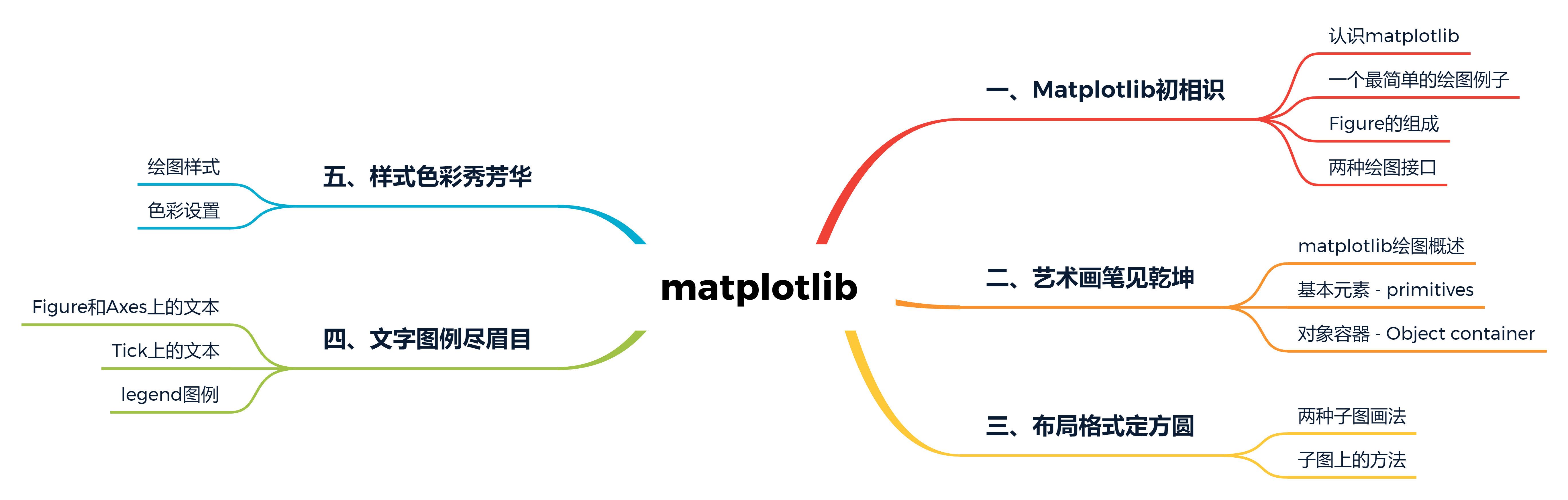 下图是该项目的大纲,总共五个章节介绍整个Fantastic-Matplotlib数据可视化项目。