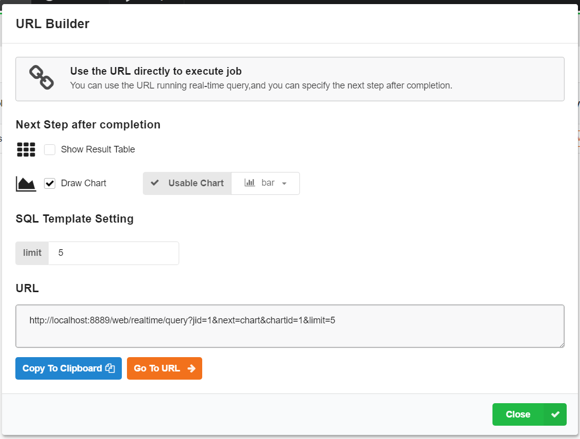 - Result:For showing the amounts of records of the job result and offering the options to express result (Table/Chart)