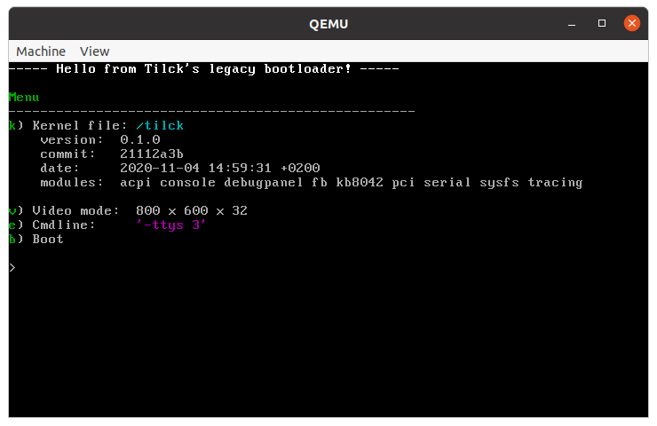 a key point in Tilck's design. Indeed, the kernel can boot and run on a i686 QEMU