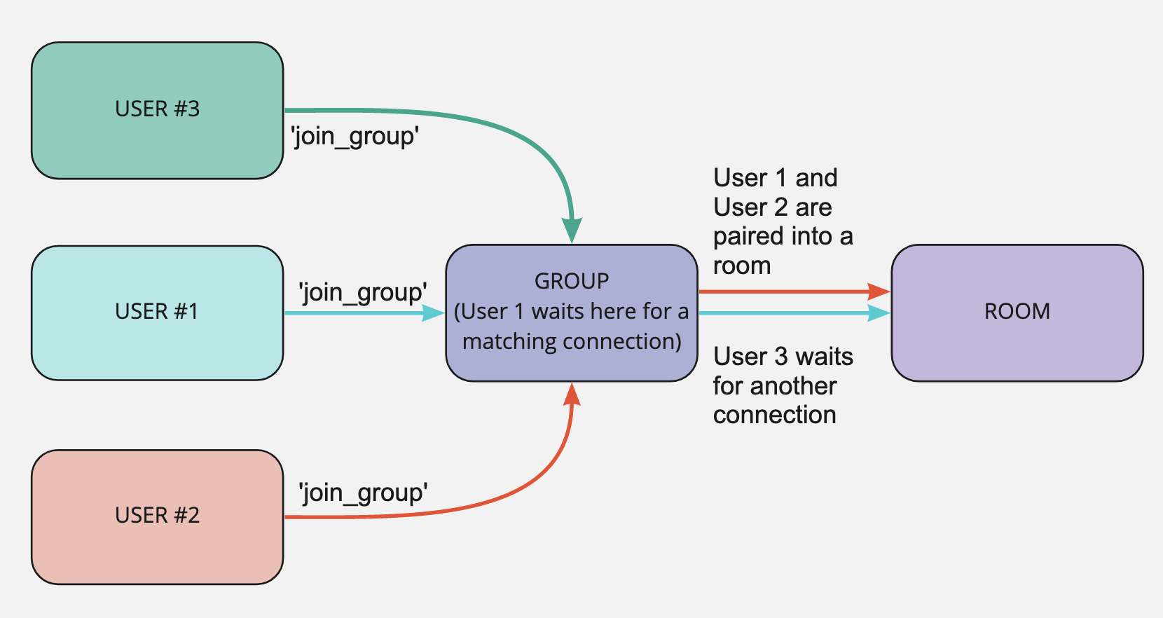 When a user joins a group they wait in a lobby for another client to connect to the same group. This information is briefly stored in the database for use in matchmaking. When there is another connection (or more then 2) the users are randomly assigned into chat rooms. This is done through the server emitting a join_room event.