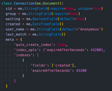 room- This is the room they are connecting too. (Stored in the client)user- Their usernamematch- This data has two pieces. The first is the second user's name and the second piece is that users socket id.
