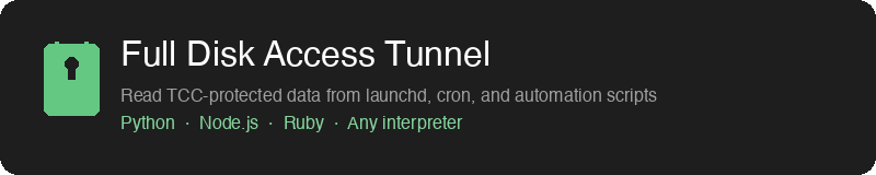 macOS TCC (Transparency, Consent, and Control) protects sensitive data — Safari history, cookies, Mail, Messages, contacts, calendars — and requires FDA to access it. FDA is granted to binary paths, not to scripts. This creates a gap for interpreter-based automation: when a Python, Node, or Ruby script needs TCC-protected data, there's no clean way to grant it access.