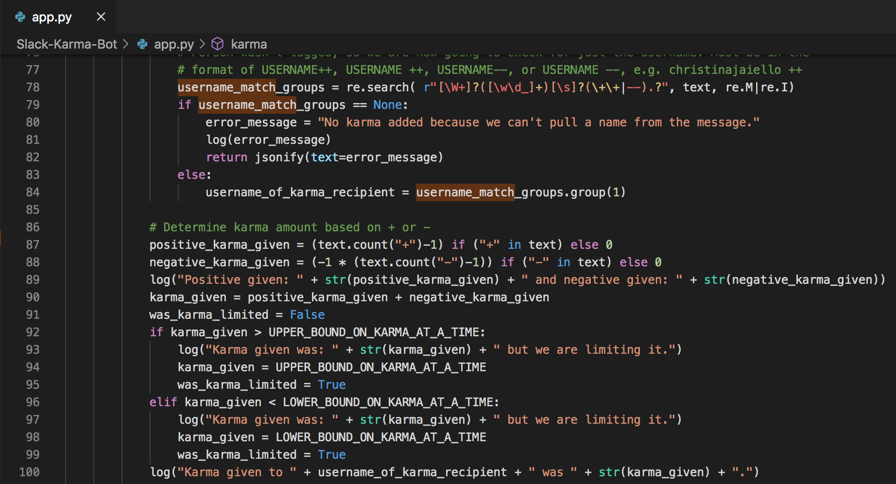 The karma function in app.py is huge and should be broken down into helper functions. Note that there are also issues open where we need a slack_client.py file and a logger file, so for this issue, create helper functions in app.py for things not related to talking to slack or logging.