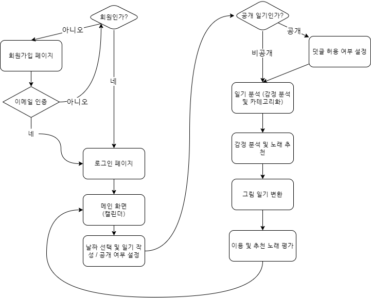 - 작성된 일기를 분석하여 감정 및 주제를 추출하고 표현된 감정 및 주제에 알맞은 노래 추천 (노래 평가 가능)
