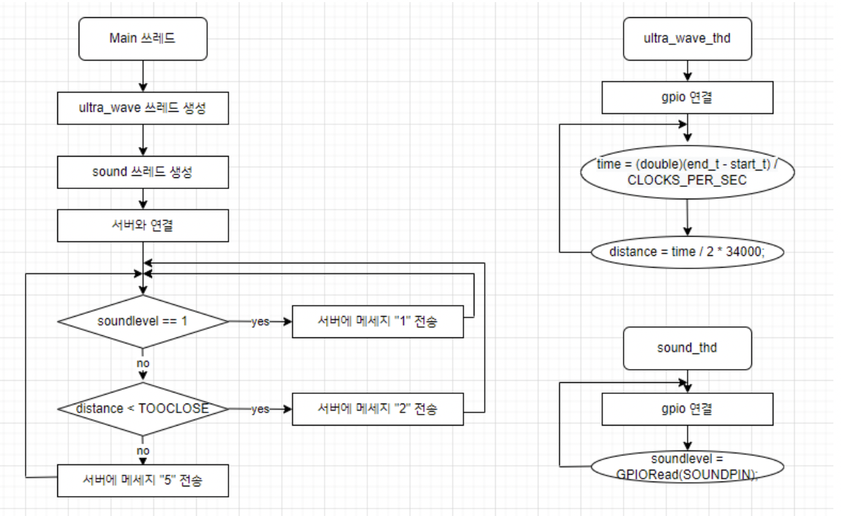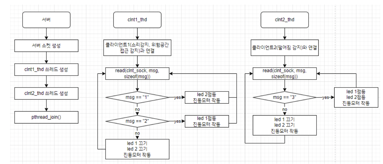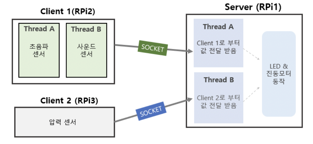 구현한 시스템은 센서를 이용해 문제 상황 발생 여부를 감지하는 클라이언트 라즈베 리파이에서(Pi2, Pi3), 발생한 문제 상황을 구별하여 이를 액추에이터로 알리는 서버 라 즈베리파이(Pi1)로 구성된다. Pi2는 사운드 센서로 일정 크기 이상의 소리를 감지하고, 초음파 센서로 위험한 공간 과 대상과의 거리를 측정하고 일정 값보다 낮다면(가깝다면) 문제상황으로 간주한다. 그 리고 발생한 상황에 대한 메시지를 소켓 통신을 이용해 Pi1에게 전송한다. Pi3에서는 MCP3008 ADC 컨버터를 SPI 인터페이스를 이용하여 사용했다. 이를 통해 압력 센서로부터 압력 값을 받고 특정 크기 이상의 압력을 입력으로 받으면 문제상황으 로 간주하고 소켓 통신을 이용해 메시지를 Pi1에 전송한다. Pi1에서는 소켓 통신을 통해 받은 메시지가 문제 상황에 대한 것이라면 진동 모터를 동작 시키고 어떤 문제상황인지 구분하여 led를 다르게 작동시킨다.