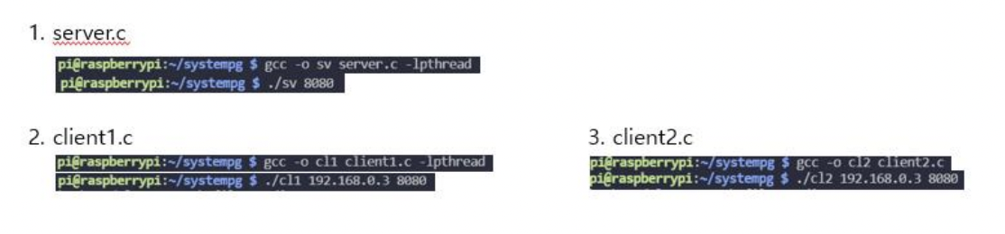 서버에 관한 파일인 server.c와 사운드 센서와 초음파 센서를 동시에 사용하는 clinet1.c는 멀티 쓰레드를 이용하기 때문에 컴파일 시 ‘-lpthread’ 옵션을 추가하여 컴파 일 하였다. 압력 센서를 사용하는 client2.c는 추가적인 옵션을 추가하지 않고 컴파일 하 였다. 우선 서버 파일을 ‘(포트번호)’를 입력 값으로 준 뒤 가장 먼저 실행했다. 이후 클라이 언트 1, 2 파일들을 ‘(서버의 IP 주소) (포트번호)’를 입력 값으로 준 뒤 차례대로 실행했다.