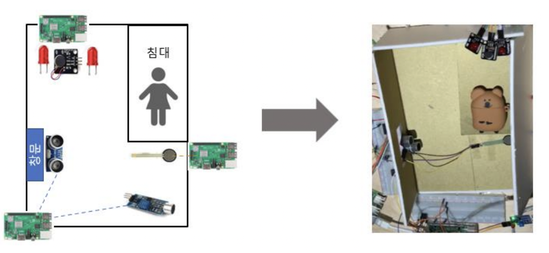 장치는 라즈베리파이를 이용해 구현되어야 한다. 이때 각 문제 상황을 인지하는 라즈 베리 파이, 부모에게 상황을 알리는 라즈베리파이가 필요하다. 우선 센서들이 장착된 클라이언트 라즈베리파이에서(Pi2, Pi3) 센서 들로부터 값을 읽 어올 수 있어야 하고 이 값을 이용하여 문제 상황인지 판단해야 한다. 그리고 문제 상황 이라면 부모에게 문제 상황을 알리는 서버 라즈베리파이(Pi1)에게 전달할 필요가 있다. Pi1에서는 Pi2, Pi3로부터 문제 상황이 발생했다는 정보를 받을 수 있어야 하고 이것이 어떤 문제 상황인지 판단하고 이를 구분하여 적절한 엑추에이터를 동작 시켜야 한다.