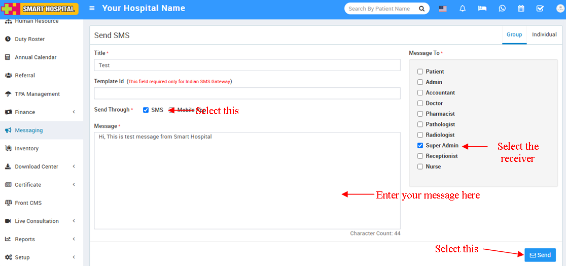 - Select Send Through : SMS.