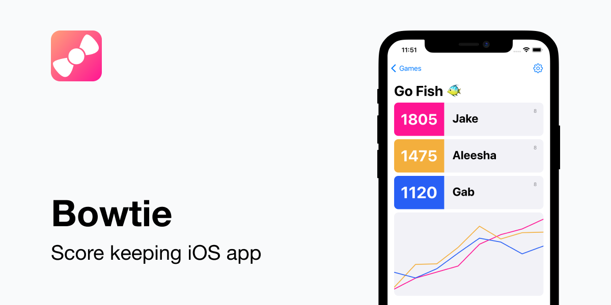 Bowtie Score keeping iOS app made with SwiftUI Website App Store Features Games synced between devices with iCloud Custom colour for each player Graph scores throughout a game History for all your previous games