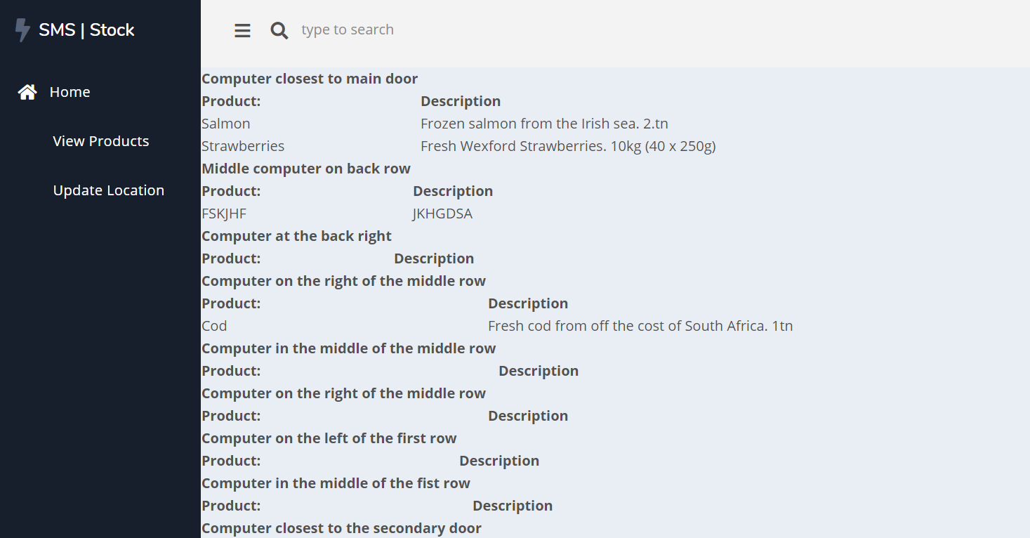 After logging into the system, the user is redirected to the dashboard. This dashboard is supposed to display a lot of the product information and locations from the database. In its current state, the information is being taken from the database and displayed but not in a nicely formatted way. Added to this, if an area is empty, the table still displays headings with no content below.