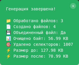 — После генерации инструмент выводит подробную статистику:- сколько байт и селекторов удалено