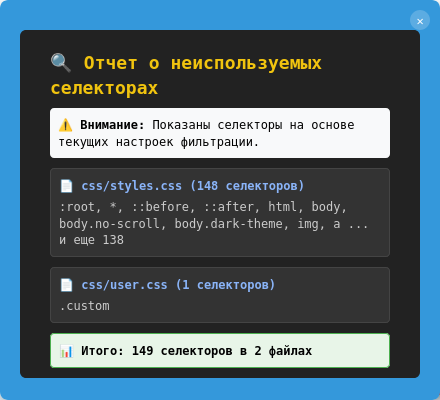 - Подробная статистика: Показывает точную экономию байтов и количество удаленных селекторов