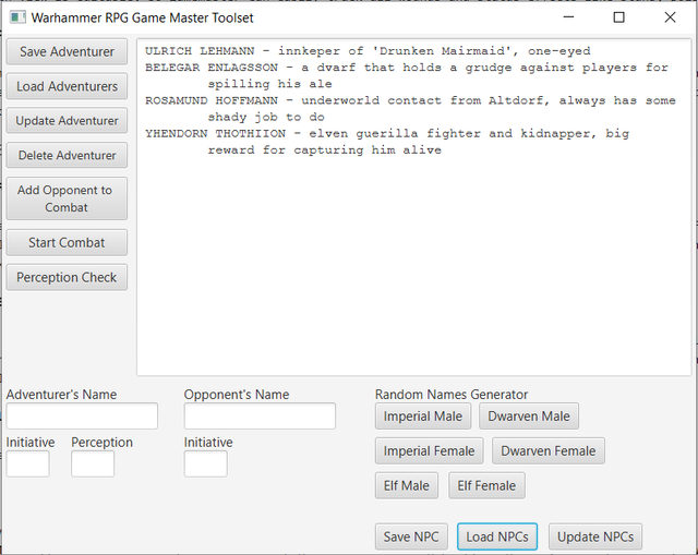If there is a chance that given NPC will return in future adventures, game master may want to save information about such NPC. After generating name, game master can write any additional information he wishes and save NPC. All NPC information is stored in a npcs.txt file.