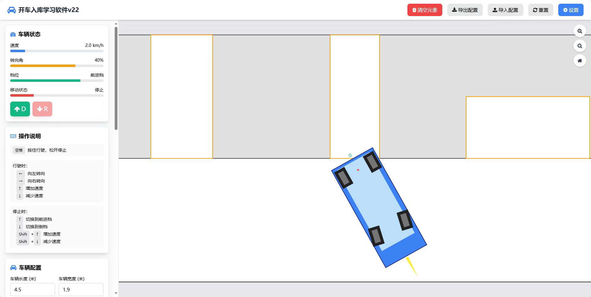 仿真汽车驾驶,可自定义车场布局、通道、车位,配置信息可导出和导入
