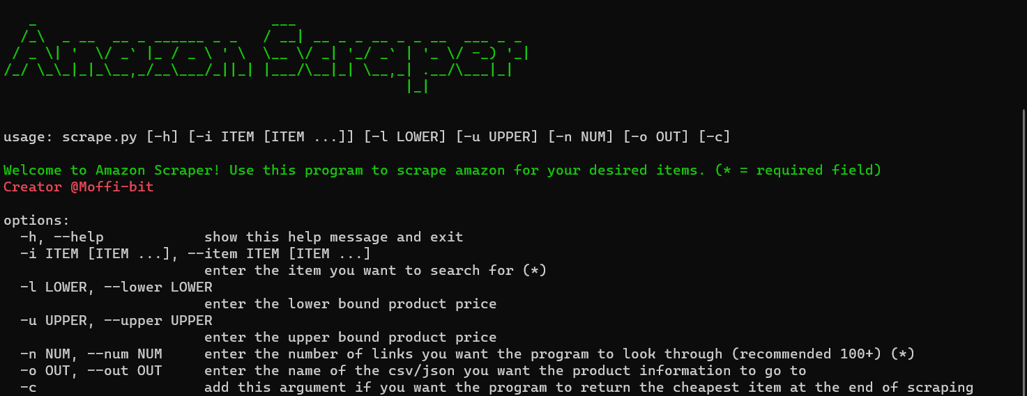 Note: Adding -c to the arguments will cause the program to print the cheapest item at the end of scraping
