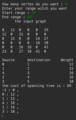 JavaAt first, the program will ask the user how many vertices he want. Then, the user adds the number vertices and the program will check the number is correct or not we mean it is not correct if it is zero or negative number, after that, the program asks the user to add a range (start range – end range) and the program should also check the rage. It should be correct. End range should be greater than start range. Next, the program generates random numbers and adds them to two-dimensional array which is matrix vertices by writeRnadomArray method. After that, the program will apply PrimsAlgorithm to create a minimum spanning tree on the vertices matrix. Finally, the program will show two windows the first one for input graph and the second on for output graph. These graphs are drawn by two methods Draw_Graph and Draw_MSP.
