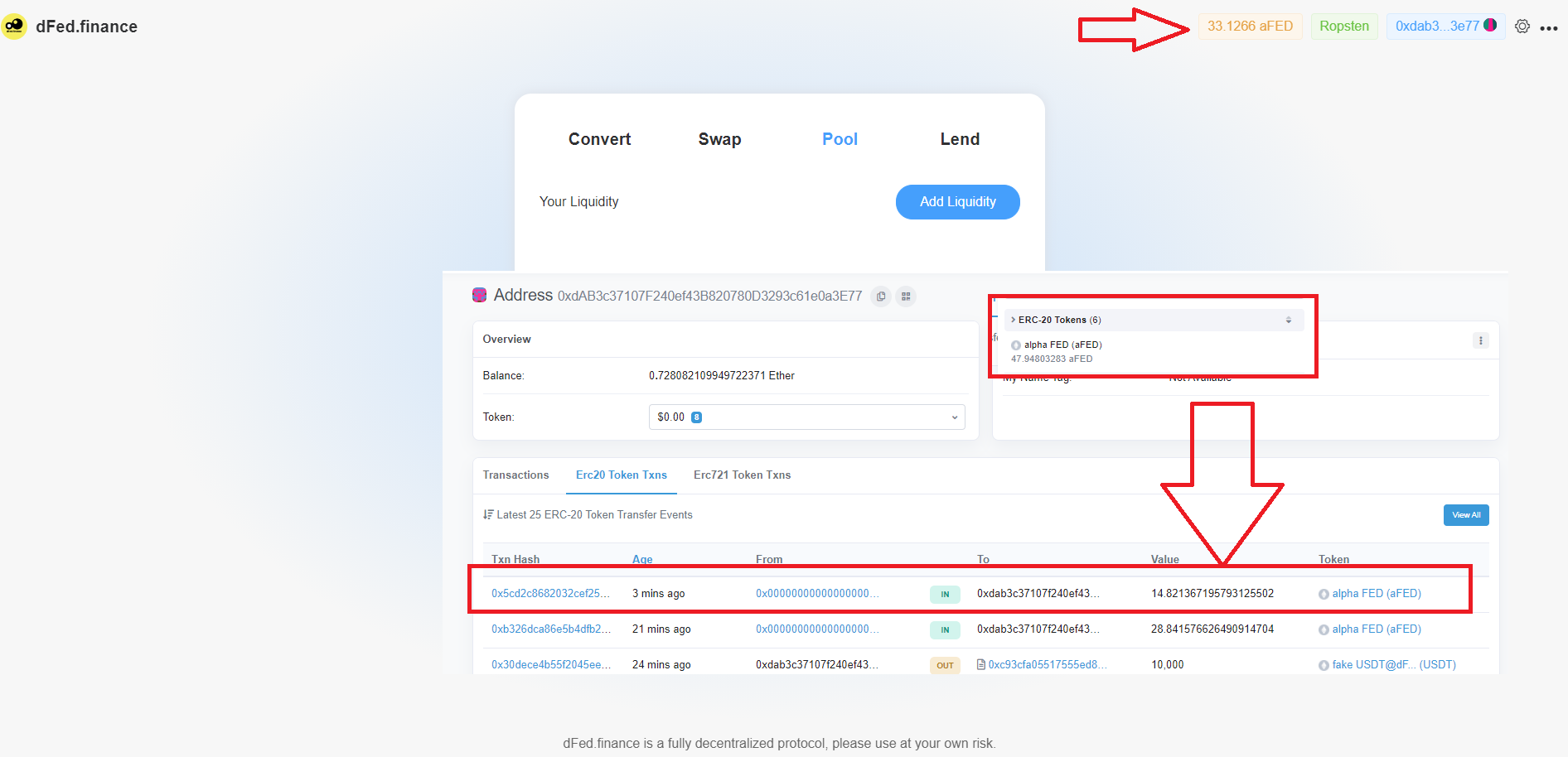 If you are using Harvest option and withdraw aFED tokens, balance will not refresh.