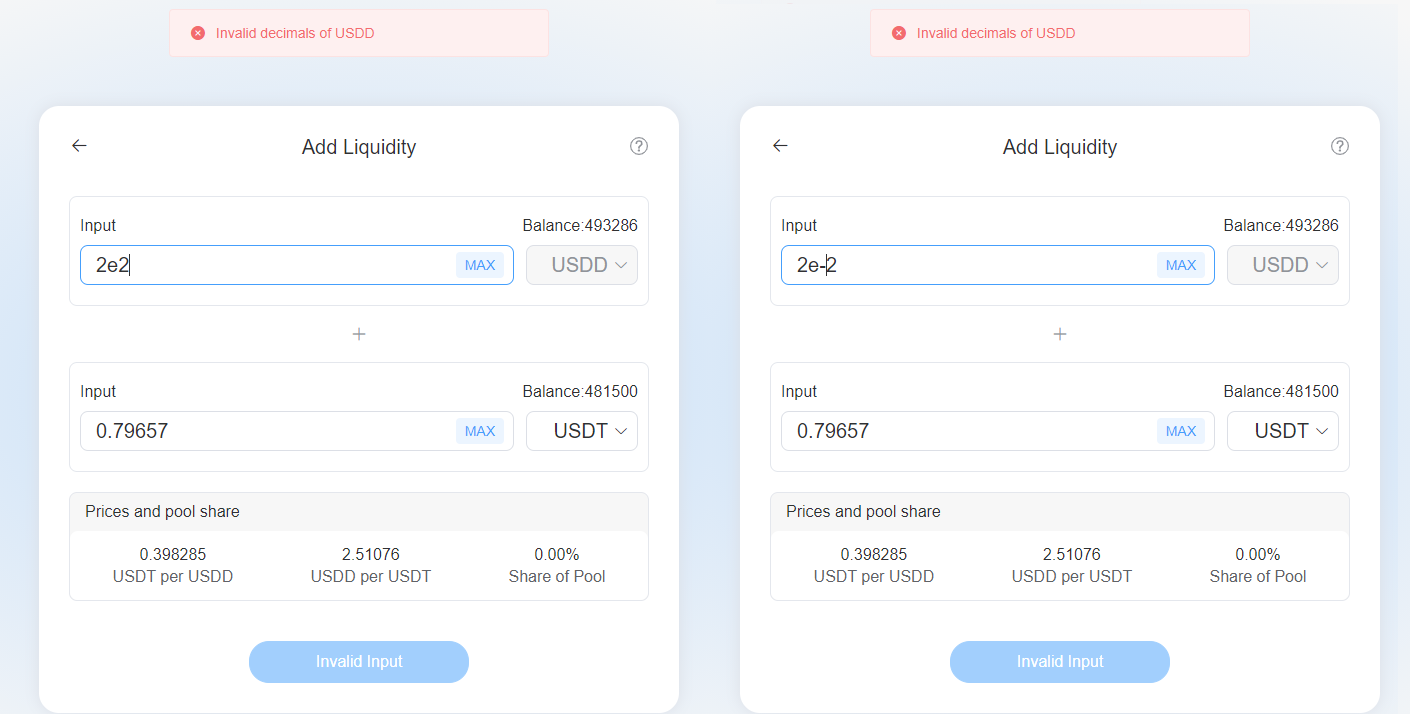 Data fields allow use symbols "e" "-" "+", so 2e2 should be 200, since "e" is exponent. 2e-2 = 0.02 But there is error message for invalid decimals.
