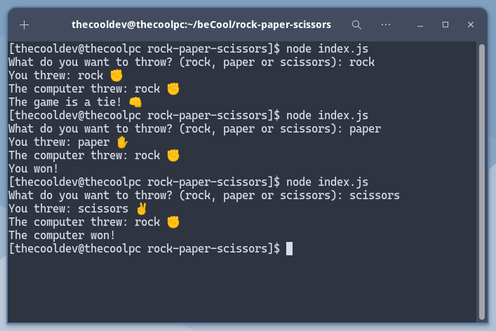 Hello there! This is a node.js Rock Paper Scissors app in which you can play Rock paper scissors in the terminal. Made this as a side project a while ago.