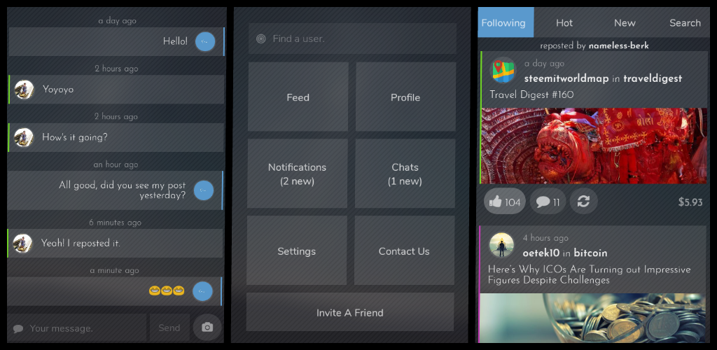 Vapor is a React Native app that integrates with the Steem blockchain, as well as a custom Node/Express/MongoDB back-end to add on functionality like messaging and notifications.