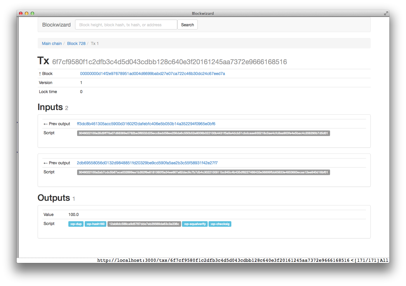 ~/.bitcoin/blkXXXXX.datfiles and can insert them into its db - Exposes a blockexplorer.com-like interface for browsing the contents of its db locally (