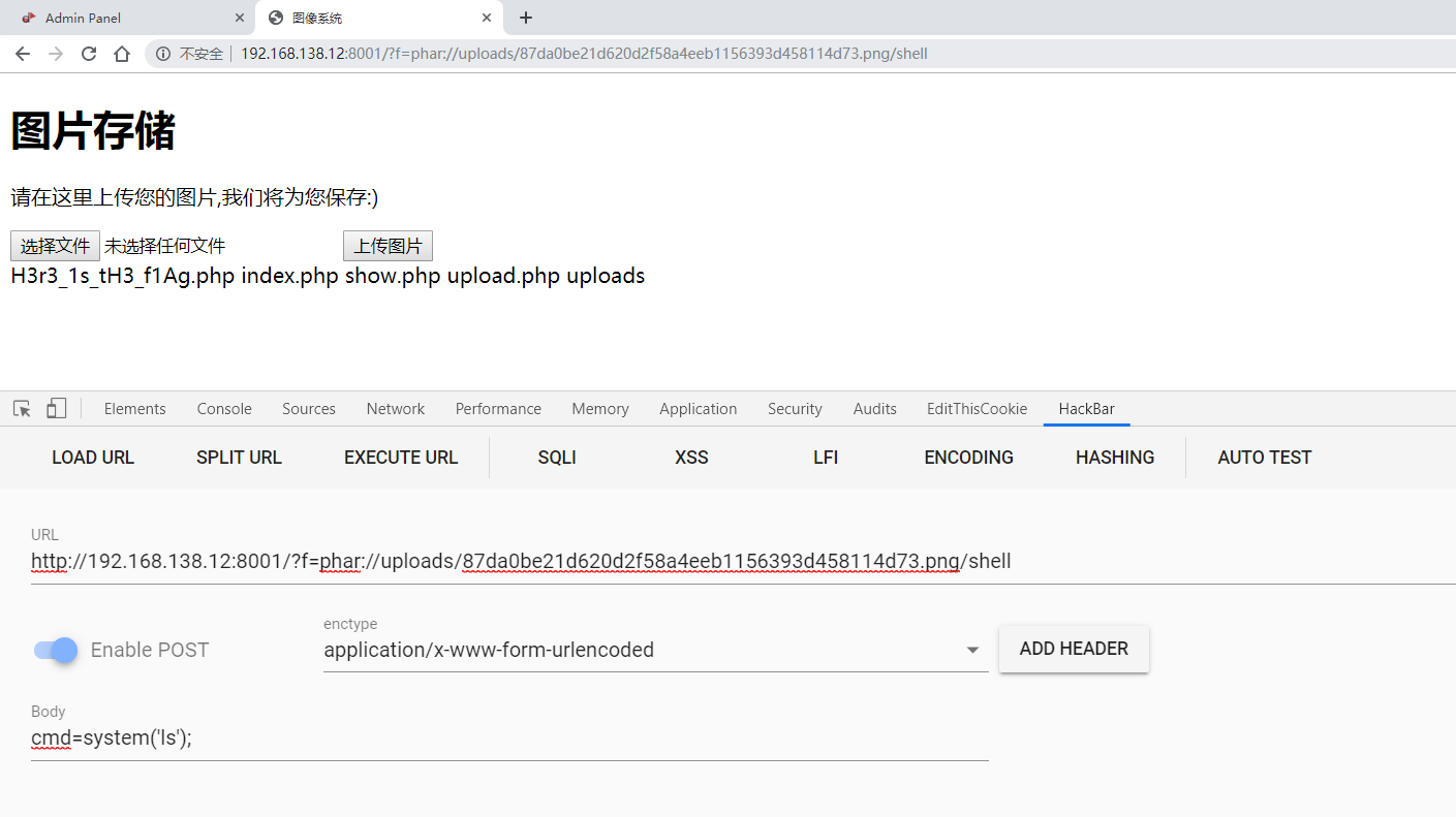 上传一个图片后发现url变为f=show&imageid=xxx,猜测f参数是包含的文件名,并且自动加.php后缀