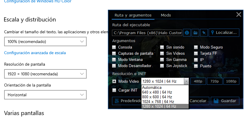 en el tab 'ruta y argumentos', el vidmode no muestra la resolución de las pantallas completas  la PC recien fué formateada, **tal vez sea por no tener el driver de video** instalada.