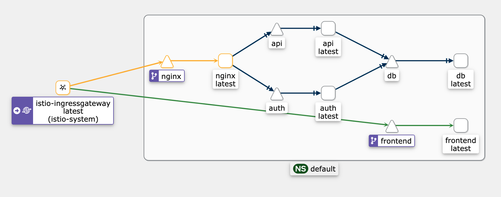 There are NodePorts exposed for NGINX, frontend and kiali. Check the services in Kubernetes to find the exact port.