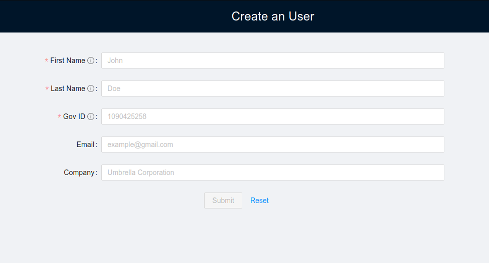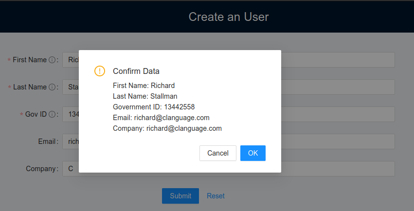 Notice if you don't fill out the required fields the submit button will stay disabled. Also you can reset the fields with the button Reset. When you click the submit button will appear a modal box asking to confirm the data given.
