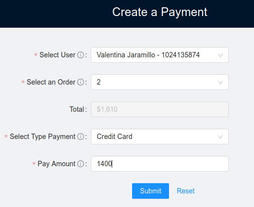 - Payments: You can select the user and the order to create a payment.