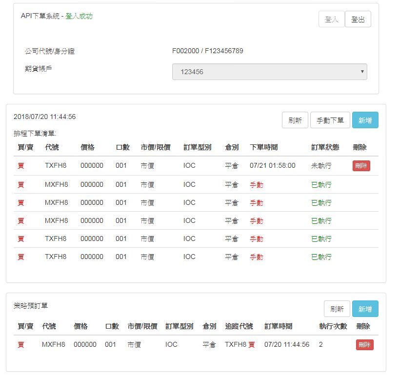 Sinopac Securities API 下單 Why 協助朋友自動排程國內期貨下單、偵測訂單做相對應回應 How ASP.NET + AJAX Program Language C#、Javascript Todolist 元件初始化 登入帳戶 憑證驗證測試 國內期貨下單 登出 功能 手動下單 排程下單 策略預訂單 其他 A little side project 單純順手筆記紀錄一下 建議使用官方新版Python API Reference : 永豐金API元件 小爺的期貨程式交易