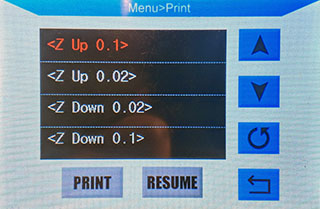 - Use the onscreen controls to lower or raise your nozzle until you feel a light resistance: (If you want to send the same command multiple times, select the item again, even though it is still marked red.)