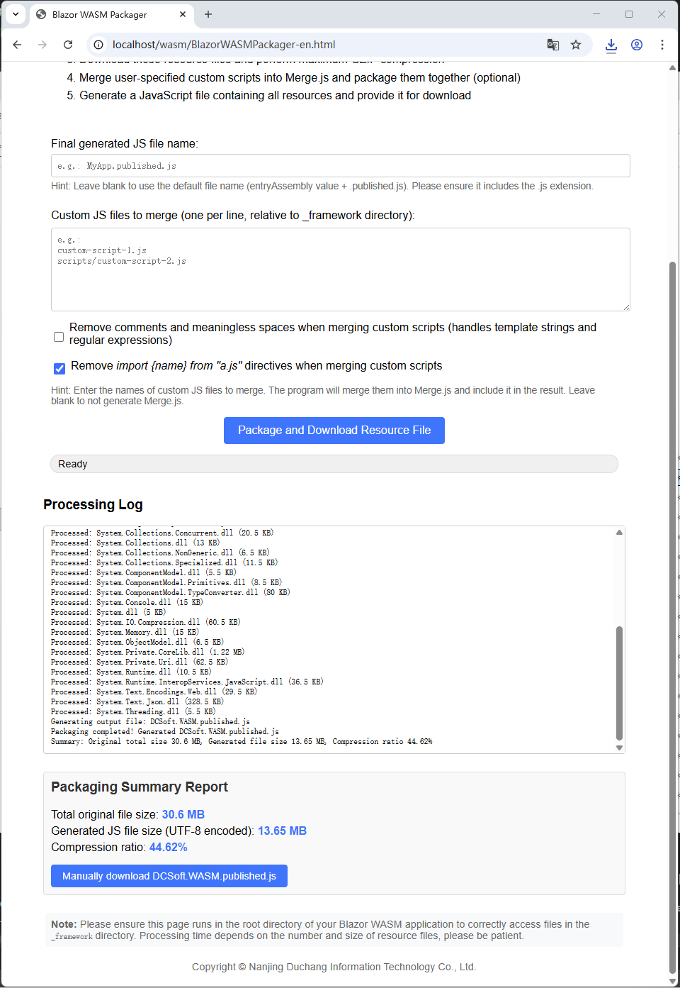 For example, for the Blazor WASM application [DCWriterApp], there are contains 61 files totaling 36.5MB. After packaging, a single JS file is generated with a size of only 15.2MB, achieving a compression ratio of 41%. Additionally, deploying with this single JS file improves the application's loading speed and avoids cross-origin resource call issues.