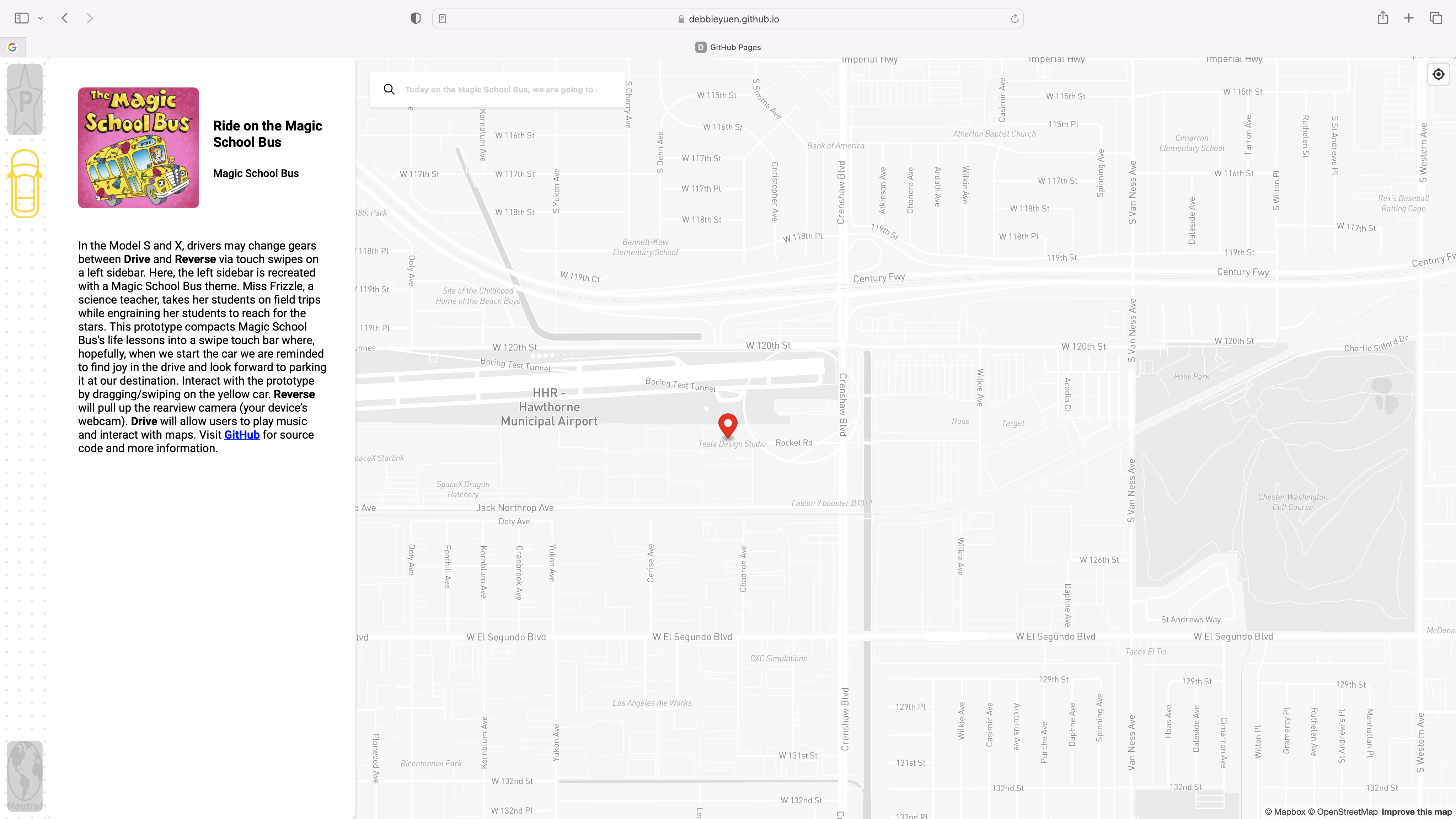 The Magic School Bus is a web application compatible with Macs and iPads. During my elementary school years, the TV Series, The Magic School Bus, brought excitement to science education and sparked my imagination. In this assignment, I bring back my childhood memories of watching Miss. Frizzle and her class launch into space to discover the unknown. In my prototype, drivers begin their launch to outer space, specifically to the stars, via drive and reverse modes. In reference to the “reach for the stars” idiom, drivers set goals to reach their destinations, the stars. Drivers are also prompted for today’s adventure destination via the input search bar with, “Today on the Magic School Bus, we are going…” written over it.