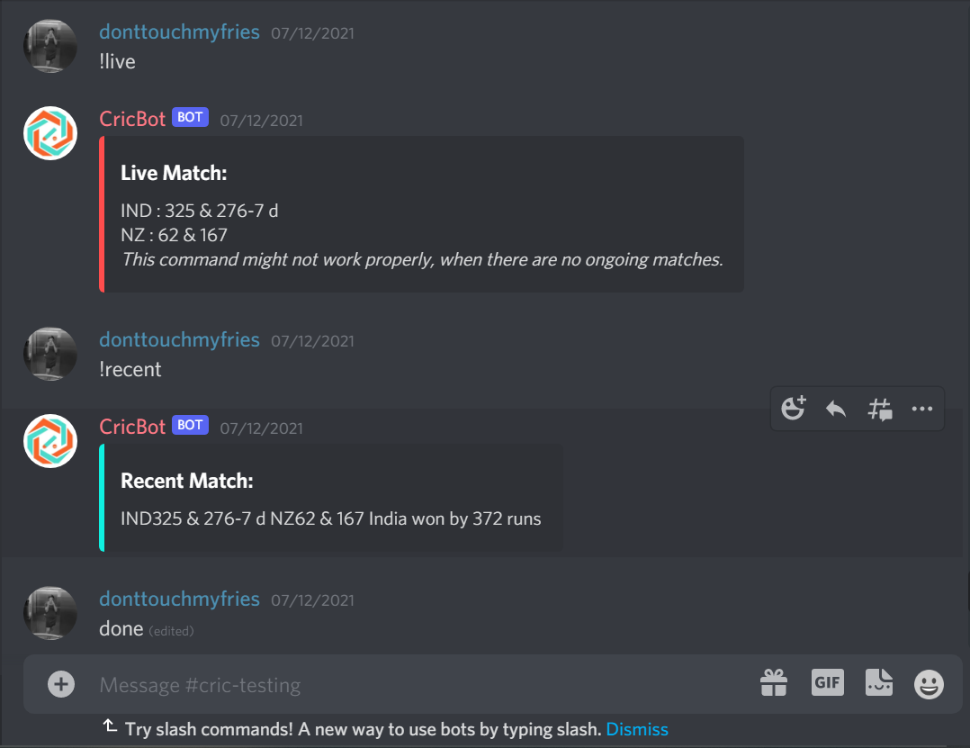 -> !recent command gives updates on the scores of the recent cricket match.
